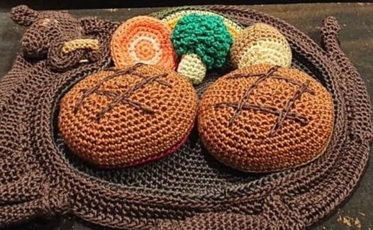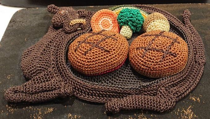 そして、にんじんやブロッコリーなどの付け合わせの野菜だけでなく、ハンバーグが置かれている牛の形の鉄板まで編み物で忠実に再現されているのが分かります!