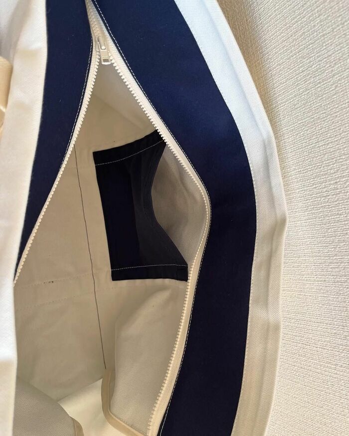 実はこのトートバッグは、うれしいチャック付きなんです!中にはネイビーカラーの小さなポケットも付いており、収納力抜群。