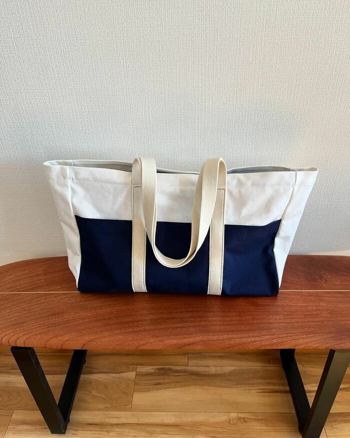 完成した写真を見ると、持ち手がついた、横長のトートバッグが!名付けて『コカドトートバッグ ネイビー』とつづったコカドさん。