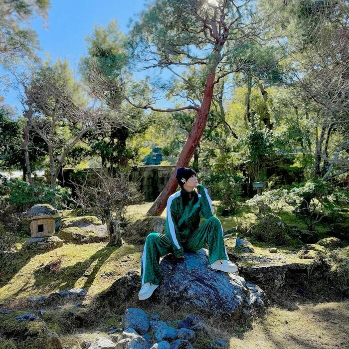 「人生賭けてみる?」というコメントとともに、日本庭園をバックに緑のジャージ姿でどこかを見つめる自身のショットを投稿した浜崎さん。