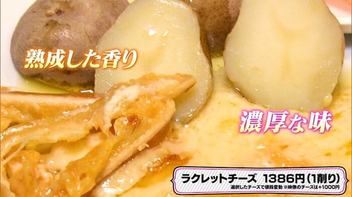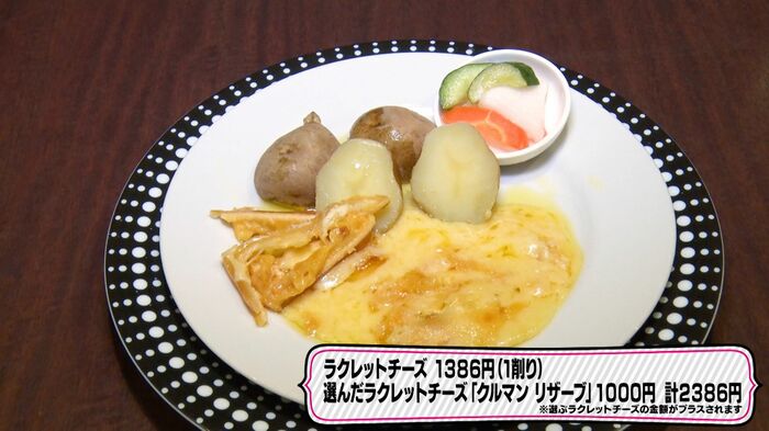 このお店では、「ラクレットチーズ(1削り)」(1386円)に、選んだラクレットチーズの種類によって金額がプラスされます。