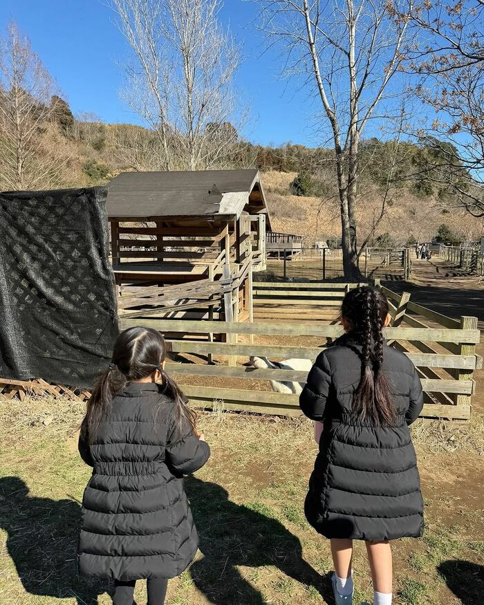 今回、娘3人と訪れたようで、エサが入ったバケツを持つ、おそろいのスカートを着た長女と次女のツーショットも。近藤さんと同じようにエサを渡しに行ったようですが…?