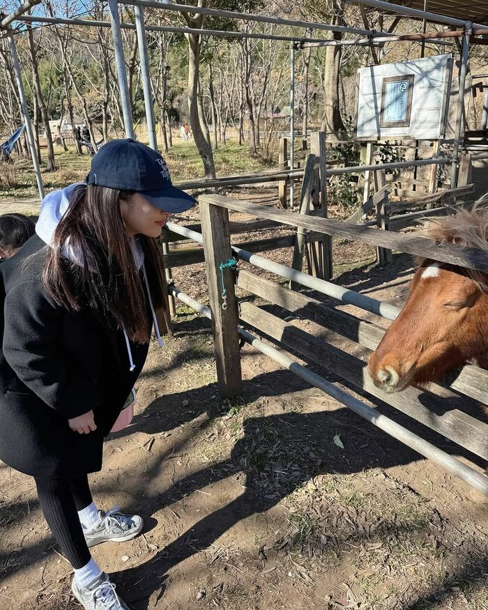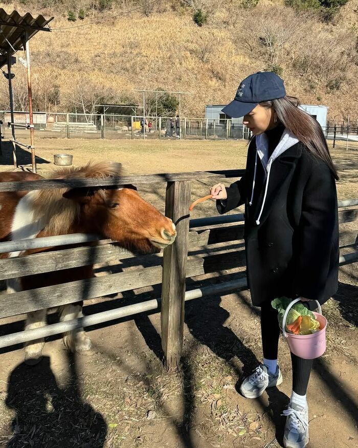 写真を見ると、キャップをかぶったカジュアルコーデの近藤さんが、ポニーにニンジンを与えています。