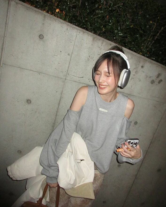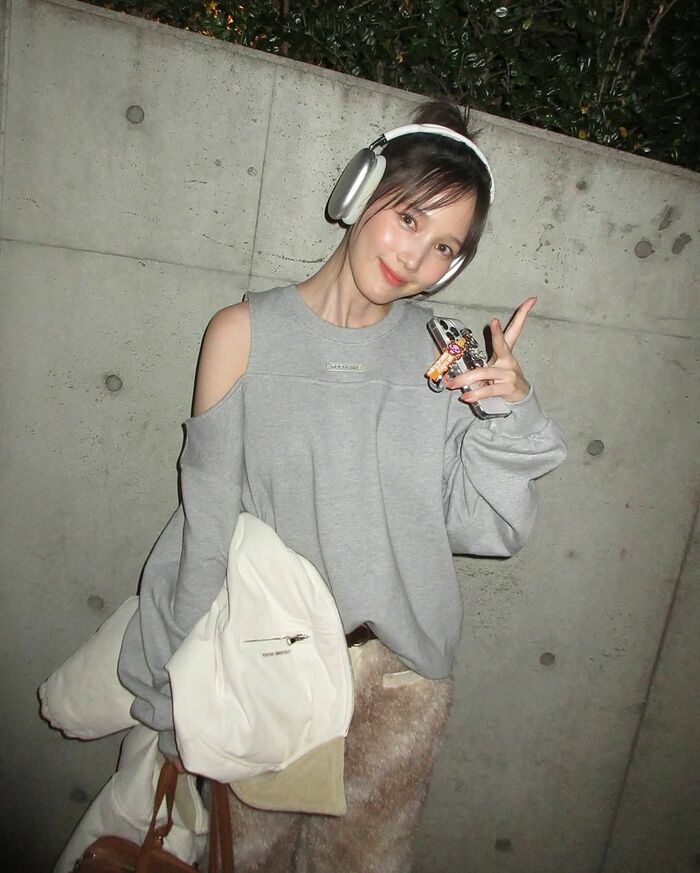 肩の部分を大胆に出したグレーのトップスにグレーのヘッドホンを身につけ、お団子ヘアでピースをする本田さんは、自然体で透明感があふれ出ています。