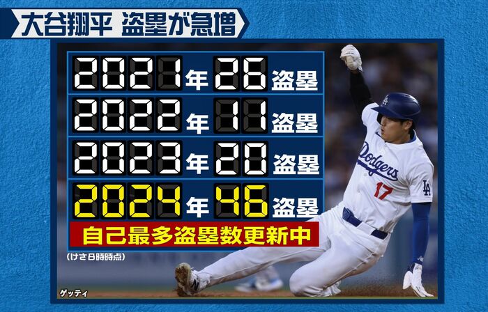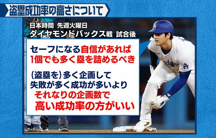 あとは、ドジャースが強いんですよ。勝っているときには走れます。盗塁は負けているときはストップするんですよ、やはり流れを止めたくないので。勝っている試合はどんどん仕掛けようと、ドジャースが勝っているというのも、盗塁のチャレンジが増えていることに関係しています。