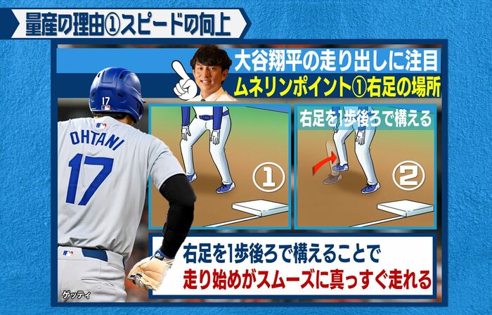 今年の大谷選手は、盗塁をする際、少し右足を引いて左足を真っすぐラインに、(次の塁に)最短距離でいけるようにしました。