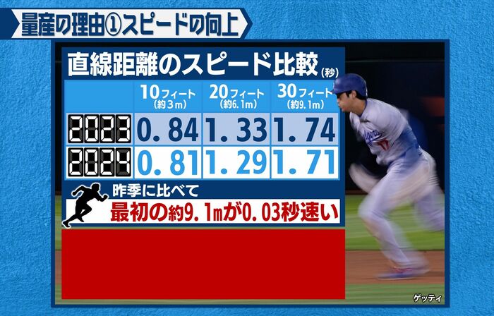 メジャーリーグ公式データサイトによると、昨季に比べて最初の30フィート(約9.1メートル)が約0.03秒速くなっていることが分かります。