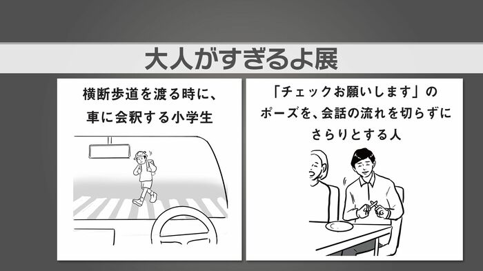 「横断歩道を渡るときに車に会釈する子ども」など、「“大人がすぎる”エピソード」では、白石さんが「エレベーターで他の人より先に降りた後、きちんと振り返って『失礼します』と挨拶できる子どもを見て、大人だな、カッコいいなと思った」と、体験談を語りました。