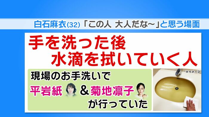 また白石さんは、「菊地凛子さんと平岩紙さんと共演したとき、手を洗った後にペーパーで周りの水滴を拭いていて、ステキだなと思った」と、エピソードを紹介。