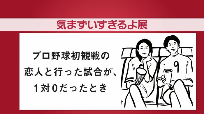 「プロ野球初観戦の恋人と行った試合のスコアが『1-0』だと気まずい」というエピソードでは、野球好きの間宮さんと千秋さんが「緊張感があるいい試合。10-0のほうが気まずい」「最高の投手戦じゃん!」と反論していました。