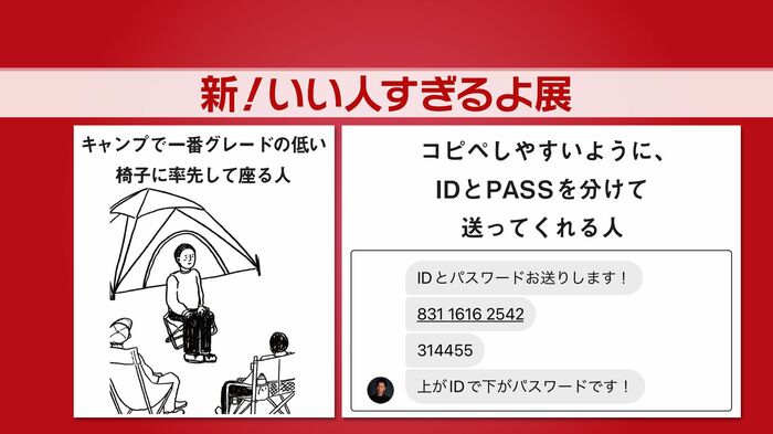 まず紹介されたのは、「IDとパスワードをコピペしやすいように分けて送ってくれる」「キャンプで一番グレードの低い椅子に率先して座る」など、周りに「いい人すぎる」と感じさせるエピソードです。