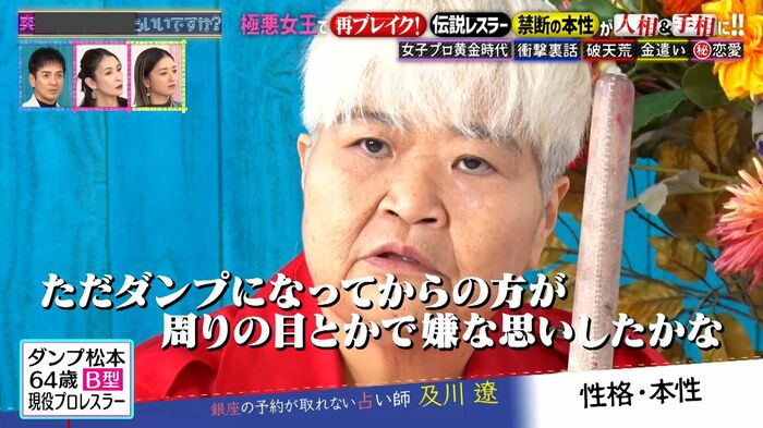 及川さんに「ヒールできないんですよ、実は」と占われると、ダンプさんはヒールをやっていたことも、嫌われていたことも、どちらもつらいと思ったことは一度もないと答えます。