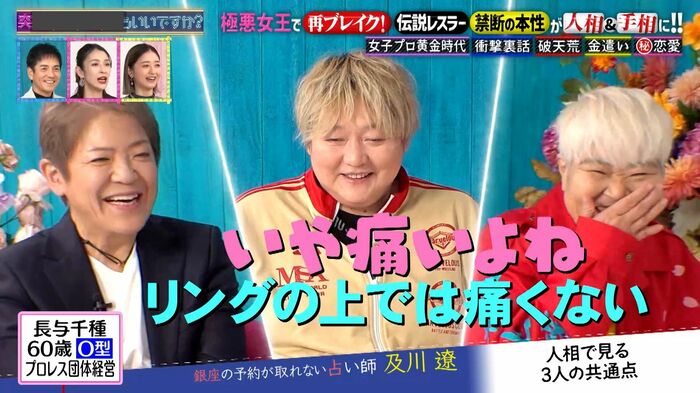 1月26日放送の『突然ですが占ってもいいですか?』は、ダンプ松本さん、長与千種さん、ライオネス飛鳥さんが、及川遼さんに占われました。