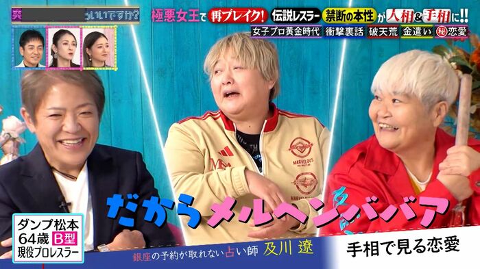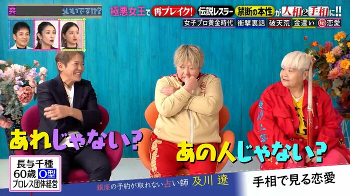 そして、2025年の運気が一番良いのは飛鳥さんだと占いました。ダンプさんは2026年にいろいろな出会いがいきなり増えて、恋愛しやすいタイミングになるそう。長与さんは「今は地盤を固める時期」と告げられると、「(人生の)いろんなことを顧みたい」と、これからの生き方を明かしました。