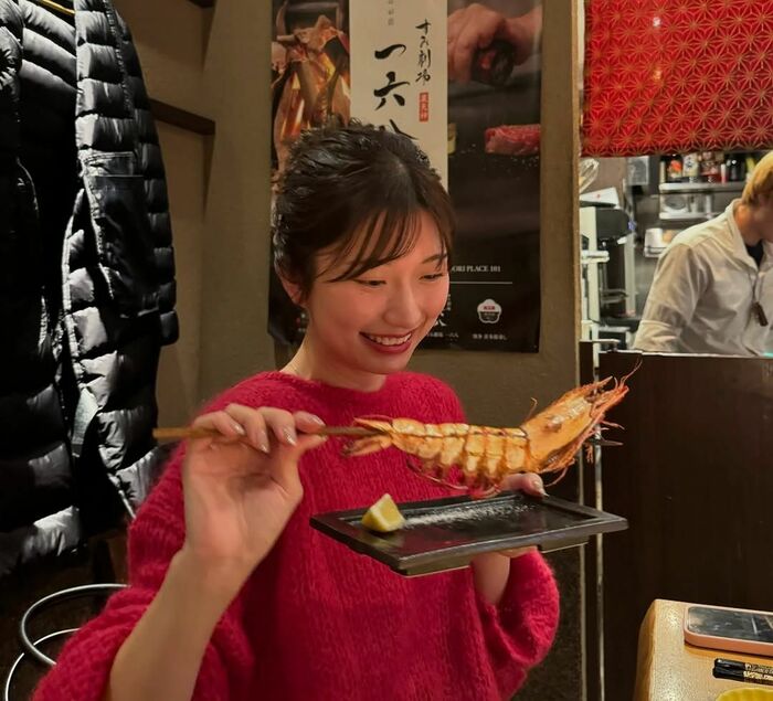 そして「俺より食べてた」と続けたたつやさんは、りこさんが手に持った大きな海老の炉端焼きを見つめ、幸せそうな笑顔を見せるショットや…