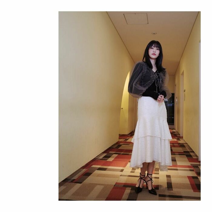 白色のマーメイドスカートが目を引く全身ショットでは、黒色トップスに加え、足元も黒色のヒールスタイル。白×黒のコーディネートで表情もクールですね!