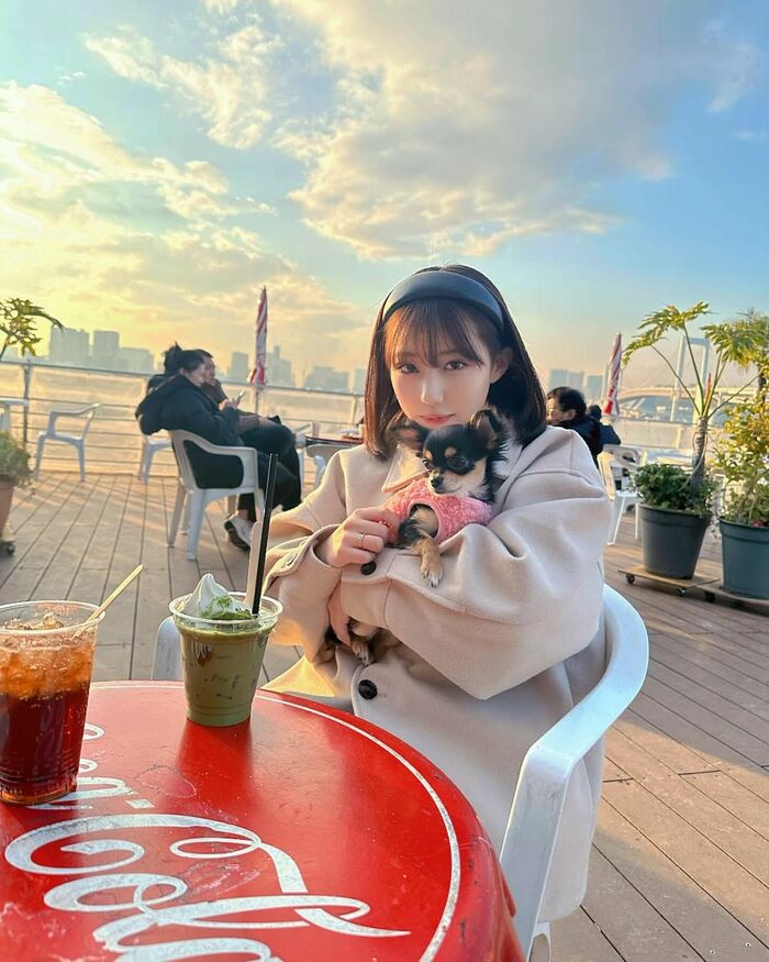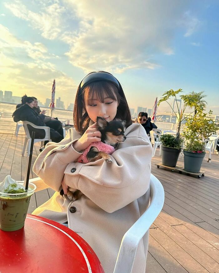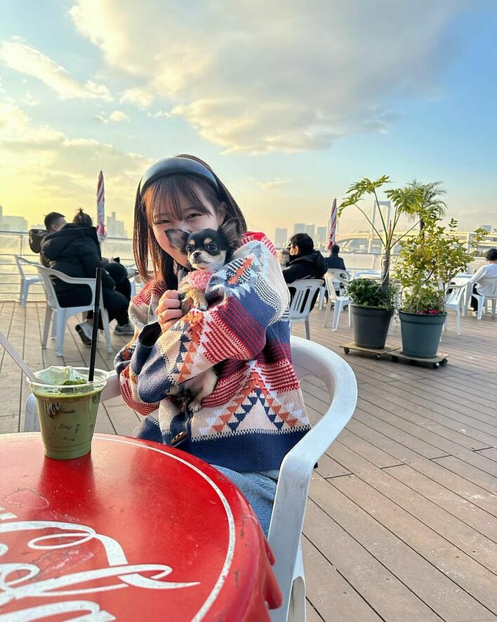 海が見えるテラスで愛犬を抱え、まったり過ごす田中さんはベージュっぽいアウターに黒いカチューシャ姿。ピンクの洋服を着ているワンちゃんとともに笑顔を見せる様子は夕暮れ時の空とマッチしていてエモ~い写真になっています!