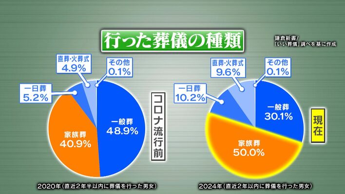 家族葬は30人以下で行われることが多く、コロナ禍前に比べると、その割合が大きく増え、全体の半数に達しています。