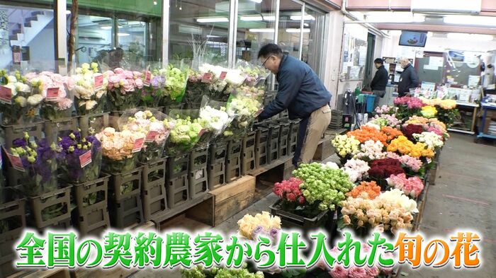 通常の葬儀では菊やカーネーションなど長持ちする花が使われることが多いそうですが、花葬儀では故人のイメージに合わせた新鮮な花を使うためにこの市場で仕入れるといいます。