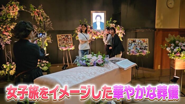ご家族は女子旅をイメージした華やかな葬儀にしたいということで、まるで一緒に旅行に来たかのような華やかな式場に。ご家族も記念撮影。