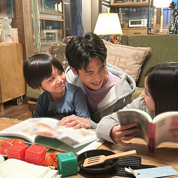 3人はリビングに集まり、千葉さんは志尊さんの膝の上に座って、志尊さんに絵本を読んでもらっているよう。増田さんはその横で本を読んでおり、志尊さんと目を合わせて微笑んでいます。