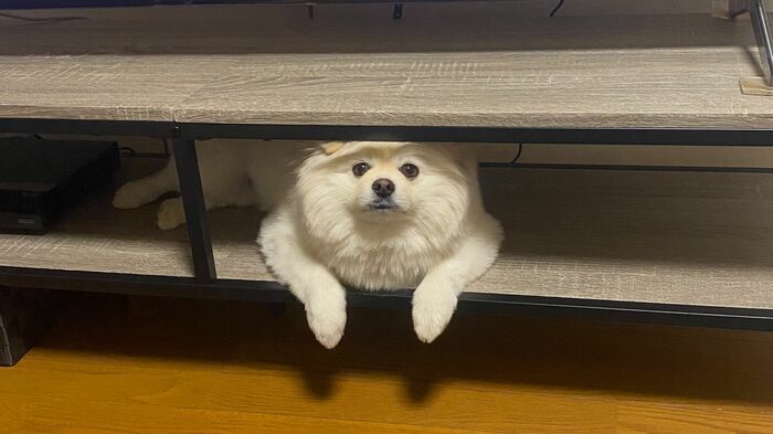 そこには、テレビ台にすっぽりとおさまり、こちらをじーっと見つめる「りん」くんの姿が!