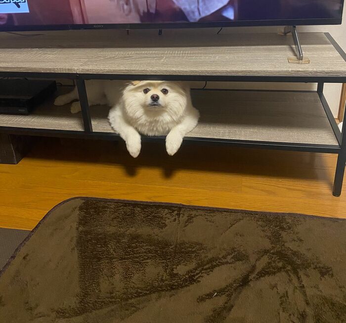 飼い主さんによると、カーペットの上で長時間なでていたそう。その後、飼い主さんがソファーに座ってテレビを見始めると、テレビ台に入り、こちらをじーっと見つめてきたということです。もっとなでて欲しかったのでしょうか。
