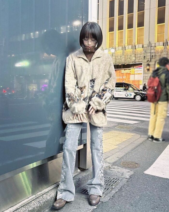 ベージュのフリースのジャケットに花柄のような刺しゅうが施されたフレアデニムを合わせたコーディネートで、細めのメガネをかけうつむき加減で下を見つめています。