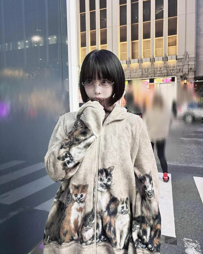 最後には、猫の総柄のジャケットを脱ぎ、ブラウンのニット姿になったショットも。