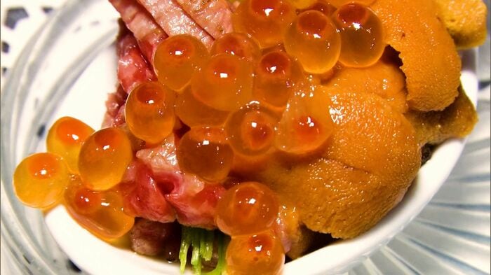 A5ランクの黒毛和牛のモモ肉を軽くあぶり、その肉で芽ネギを巻き、北海道・根室産のウニ、自家製のイクラのしょうゆ漬けを乗せたら完成。口の中で幸せが広がる逸品です。