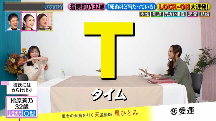 そして星さんが「一番相性が良いのは◯◯年生まれ」と言うと、指原さんはやはり心当たりがあるようで「ちょっと待って…マジで(VTR)使えないかも。ほんとに怖い!」と動揺し、収録に“タイム”をかける前代未聞の展開に。