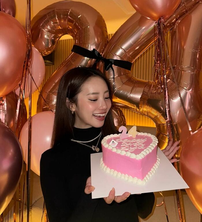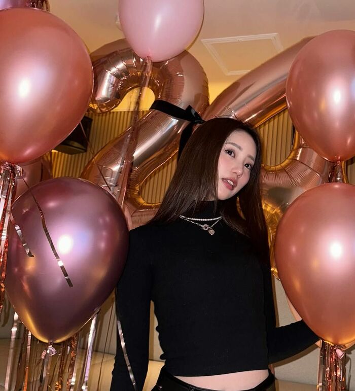写真を見ると、ピンクカラーの風船に囲まれた部屋で、おへそをチラ見せした黒コーデ姿を披露!後ろには「24」の形の風船も飾られています。