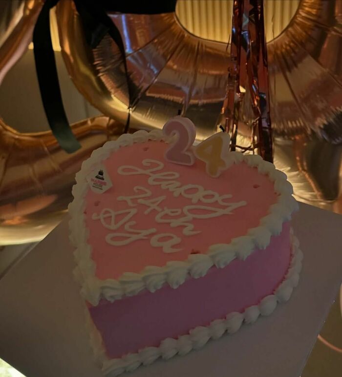 今回の誕生日会では、ホットピンクカラーのハート型をクリームで囲った、バースデーケーキをもらったそう!ケーキ表面には「HAPPY 24th Aya」とつづられていました。