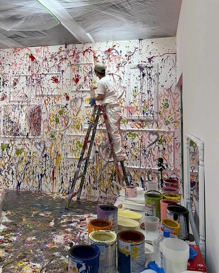 また、脚立にのぼり、壁の高い位置にまで色を塗った様子も!手形に加えて、たくさんのハートが描かれていました。