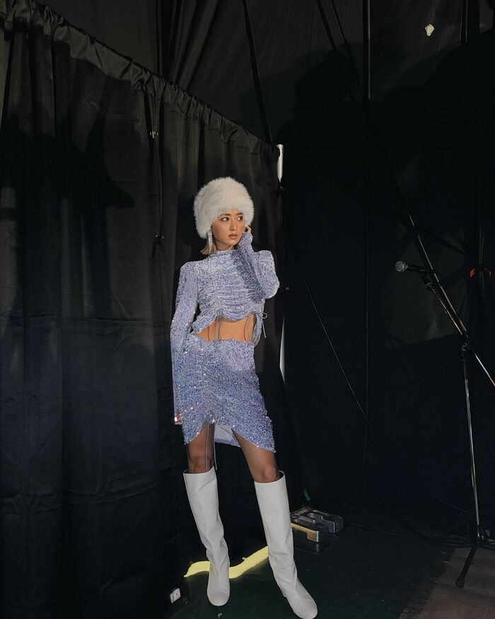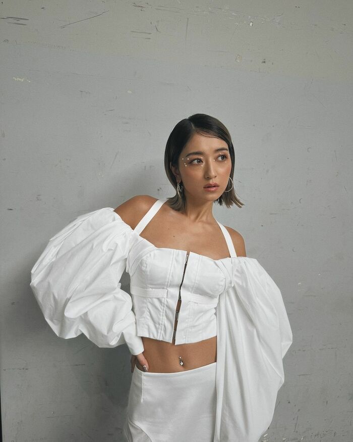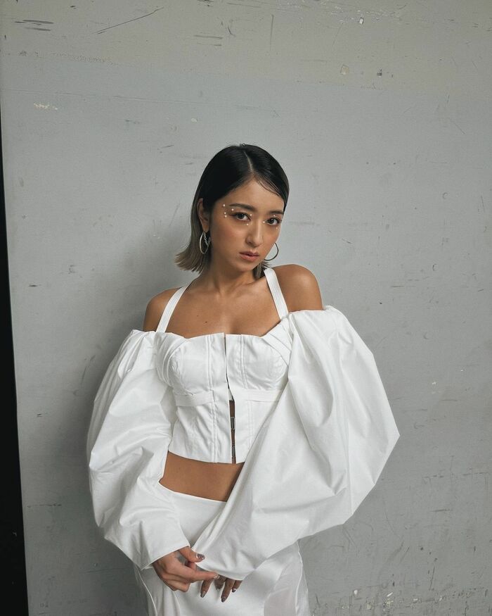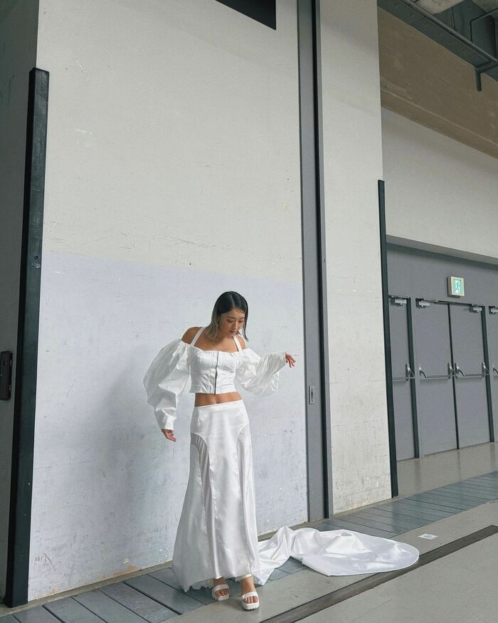 全身の写真では、まるでウェディングドレスのように長い裾が印象的で、セットアップの間からのぞく美腹筋も!