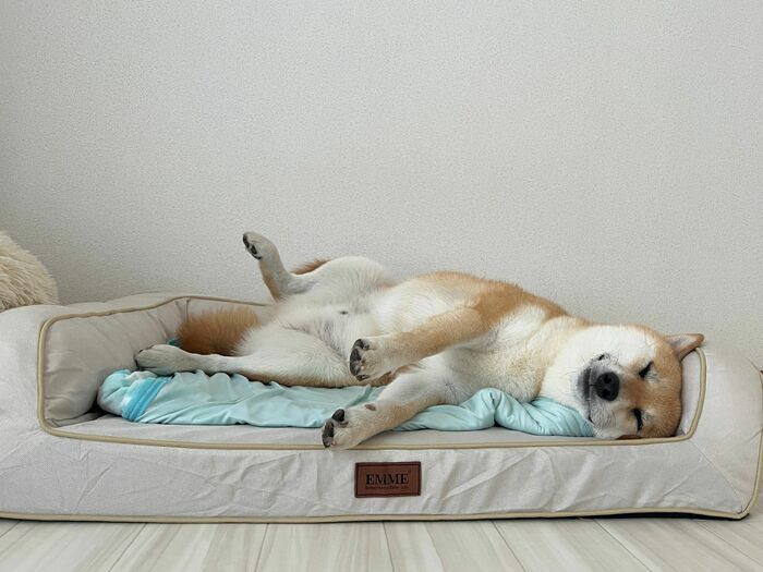 犬用のベッドの上で、前足をぴんと伸ばし、おなかを見せながら爆睡していたりと、思わずクスッと笑ってしまう姿を見せてくれます。