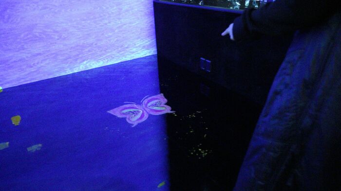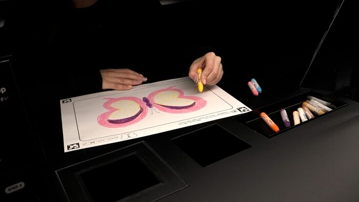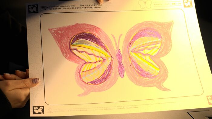 早速、鈴木アナが描いたカラフルなチョウを機械でスキャンして、アートの世界に登場させていきます。