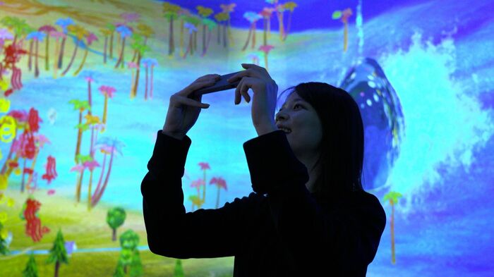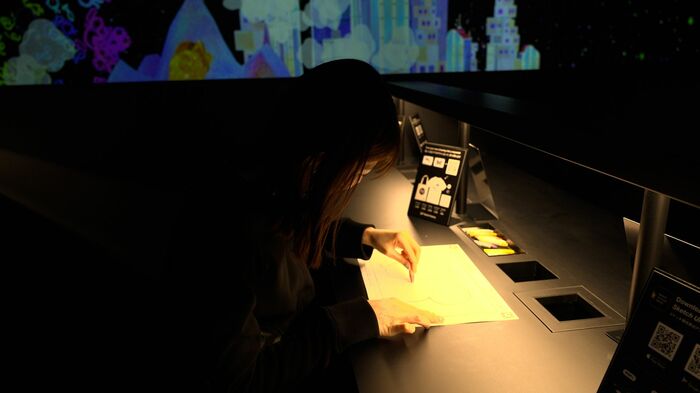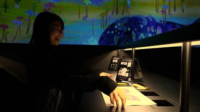 壁一面に広がるアートの世界に、自分で描いた絵を出現させることが出来るこのエリア。