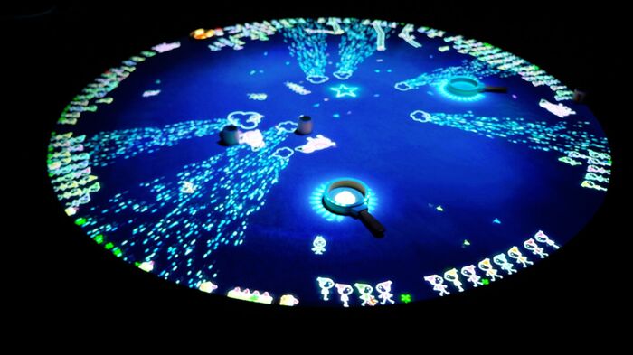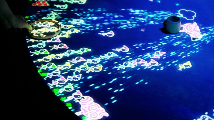 テーブルに手を置いたり、コップや皿などの物を置いたりすることで、それに合わせてかわいらしい小さなキャラクターたちがジャンプしたり、よじ登ったりします。