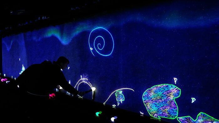 さらに、壁面には光のペンで線を描いたり、光のスタンプを押して、絵を描くことができる空間も!