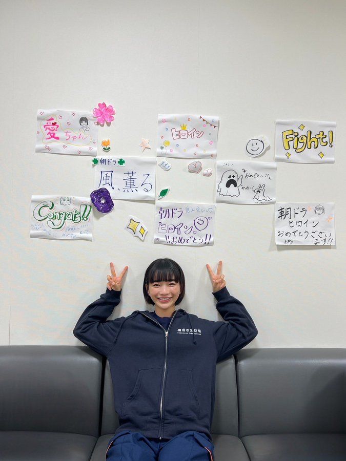 また、見上さんの後ろの壁には「朝ドラ 風、薫る」「朝ドラヒロイン!!おめでとう!! 清野」「おめでとう~!!やったー! セトコウジ」「朝ドラヒロインおめでとうございます!!上杉」などと、書かれた紙が貼られています。