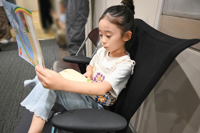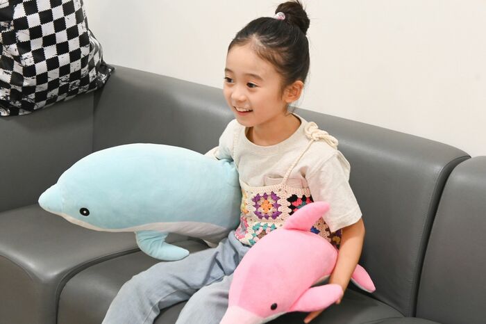 真っ白なイルカの人形と、カラーペンがセットになったおもちゃです。自分で色を塗ってオリジナルのイルカを作れるようで、泉谷さんは同封されていたイラストをじっくり見て、楽しそうにイルカに着色していました。