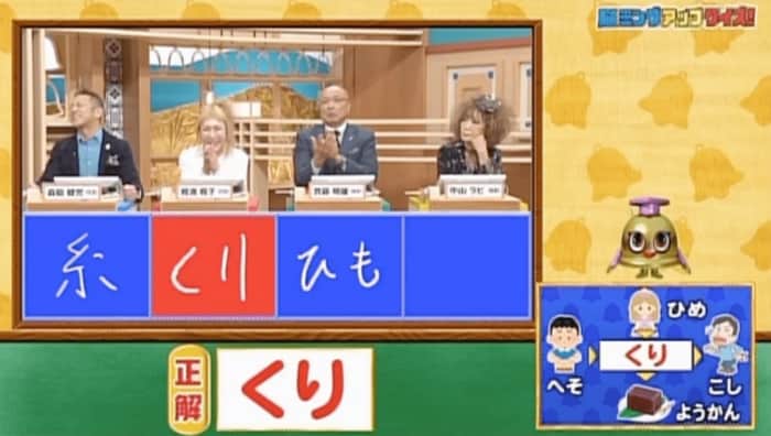 正解は「くり(へそくり・日めくり・繰り越し・栗ようかん)」。