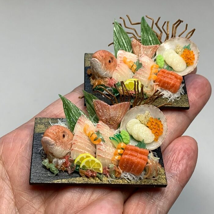 実はこのお刺身は粘土で作られており、手のひらに乗るほどのミニチュアサイズなんです!