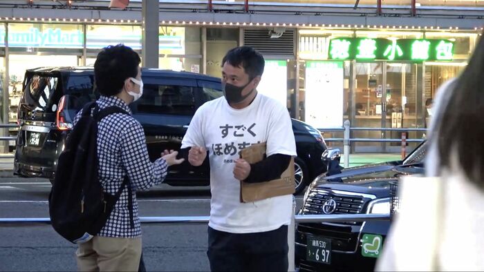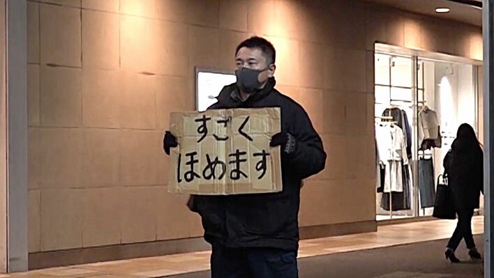 「すごくほめます」と手書きの段ボールを掲げる「褒めますおじさん」(42)です。