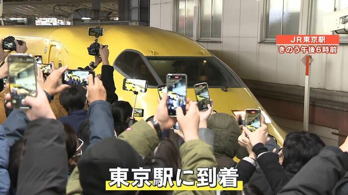 午後6時前に終点の東京駅に到着、集まった人々から歓声が上がりました。