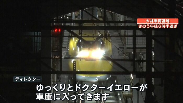 大井車両基地にドクターイエローの姿が見えてきました。ゆっくりとドクターイエローが車庫に入っていきます。