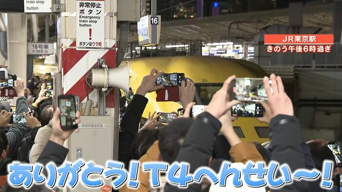 駅員の粋なアナウンスとともに出発するT4、走行する車両の窓には、「ありがとうT4」と感謝のメッセージが貼られていました。