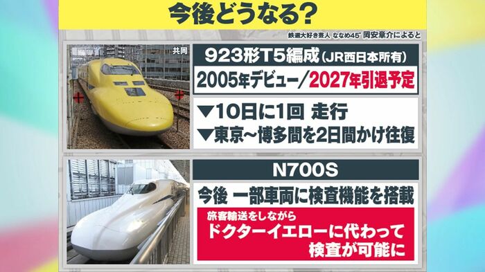 こちらも2027年以降をめどに引退を予定しており、その後は、今までの特別車両ではなく、主力車両の「N700S」に検測機器を搭載し、営業走行しながら検測する方法に切り替える計画です。