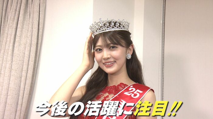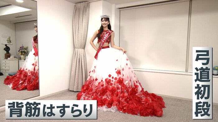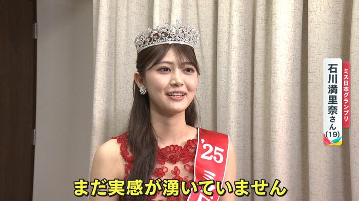 まだ実感が湧いていません。ですがこういうドレスだったり、ティアラだったり、歴代のグランプリの方たちがつけてきたこのたすきを身につけることで、改めて、私がグランプリを取ったんだなっていうふうにうれしく思います。